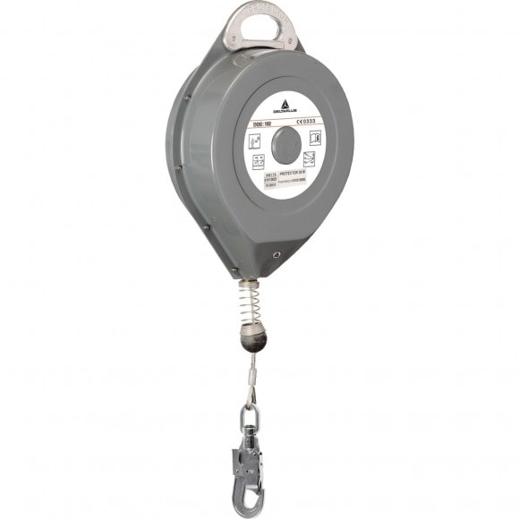 Samonavíjacie zariadenie na zachytenie pádu s lanom z galvanizovanej ocele s integrovaným tlmičom pádu. Oceľový kryt. Indikátor pádu. Inerciálny blokovací systém.