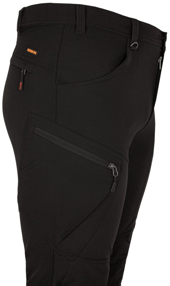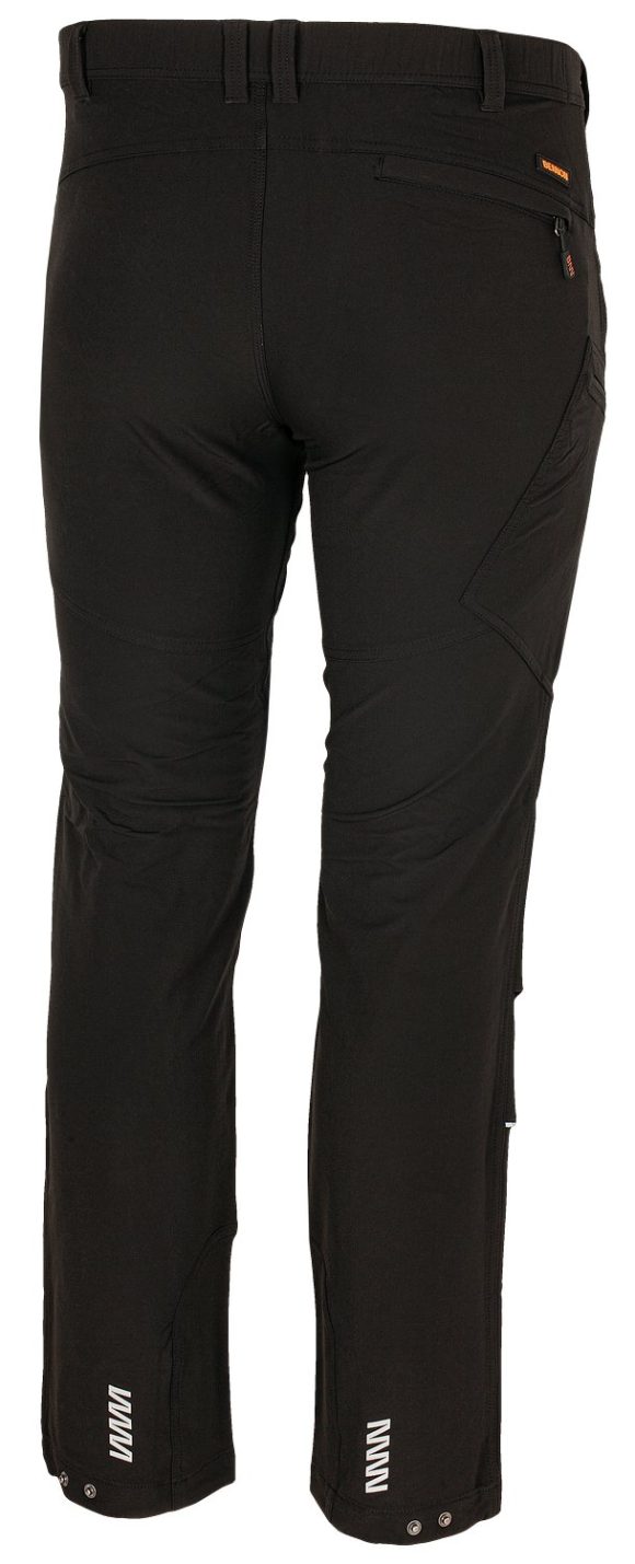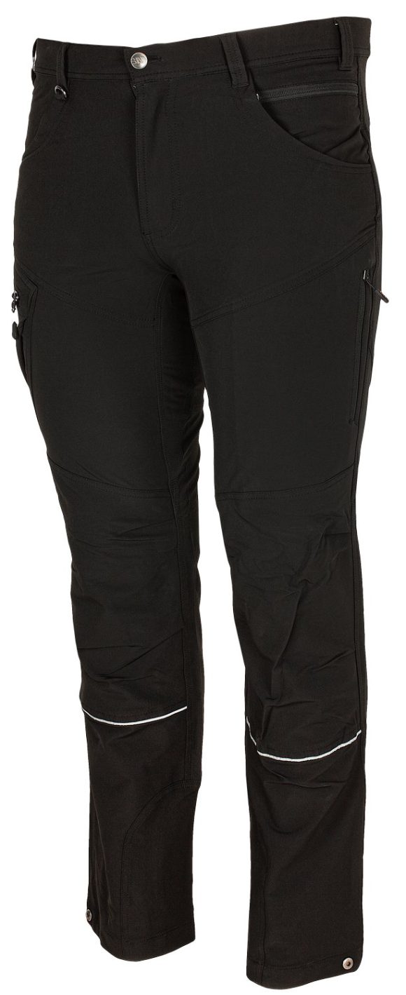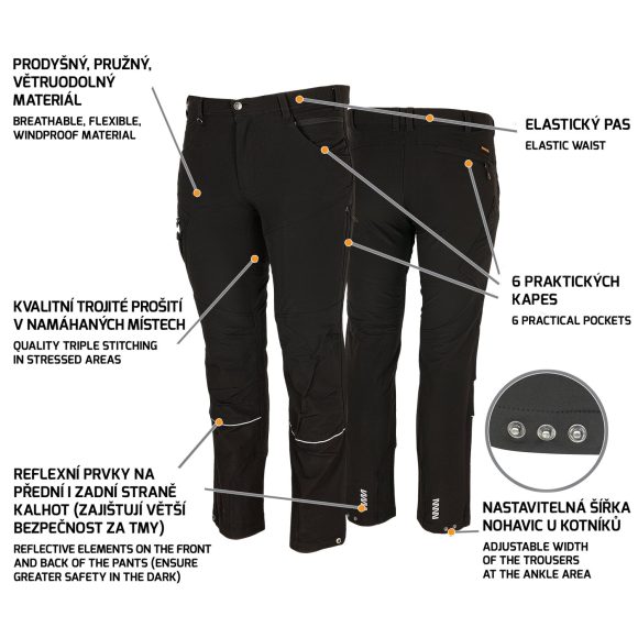 Outdoorové strečové nohavice z pevného, pružného a ľahkého materiálu, ktorý poskytuje voľnosť pri pohybe. Majú pružný pás na gumu vzadu, ktoré sa dokonale prispôsobí postave, kovovú sponu na pútku na zavesenie kľúčov apod., nastaviteľnú šírku nohavíc, kvalitné trojité prešitie na namáhaných miestach (v oblasti rozkroku a na vnútornej strane nohavíc), 2 predné vrecká, 4 vrecká na zips (1 na prednom diele, 1 vzadu a 2 na nohaviciach) a reflexné prvky na nohaviciach pre väčšiu bezpečnosť za tmy.