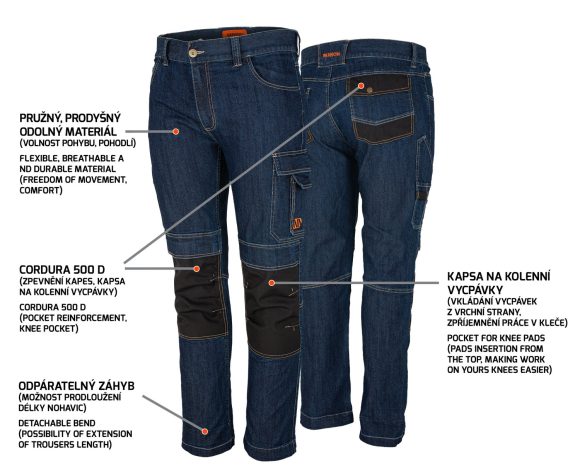 Veľmi pohodlné pracovné džínsové nohavice ušité z odolného, priedušného a navyše aj veľmi pružného materiálu, takže je ich nosenie maximálne príjemné a umožňuje voľný pohyb pri práci.