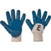 Modré rukavice šité z bavlneného úpletu, polomáčané v nitrile, s pružnou manžetou.