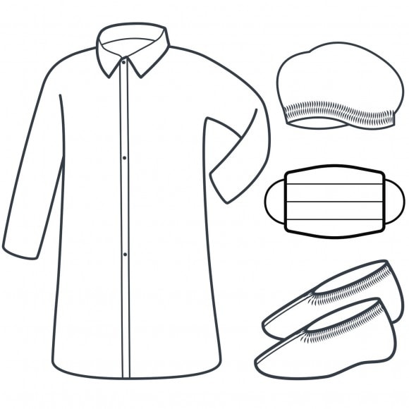 1 polyetylénový plášť (BLOUSPE), 1 polypropylénovú skladanú čiapku (PO111), 1 dvojvrstvovú skladanú masku (MASQU2), 1 pár polyetylénových návlekov na obuv (SURCHPE).