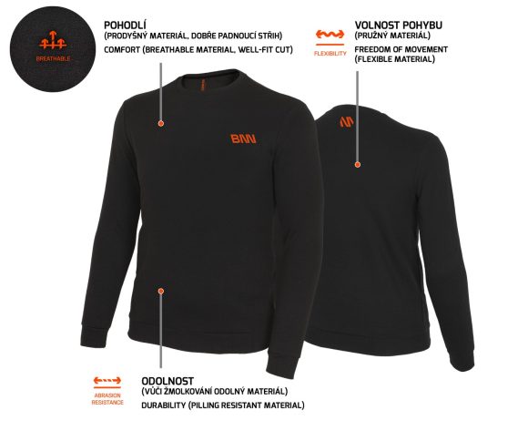 Pohodlný čierny pánsky sveter, ktorého prednosťami sú: priedušnosť a pružnosť, príjemný, veľmi odolný, kvalitný materiál, 3 x väčšia odolnosť voči mechanickému poškodeniu ako stanovuje štandard (odolnosť voči žmolkovaniu), dobre padnúci strih. Vďaka týmto vlastnostiam môžete túto mikinu nosiť ako v práci, tak aj vo svojom voľnom čase.