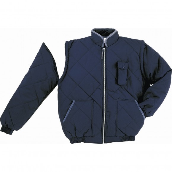 Bunda do pásu s odnímateľnými rukávmi. Elastická spodná časť a konce rukávov. 4 vrecká.