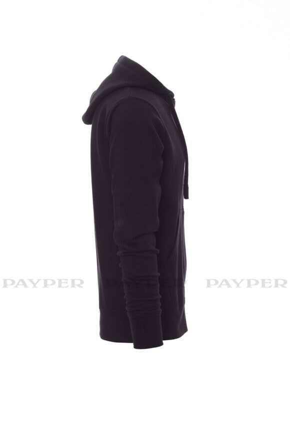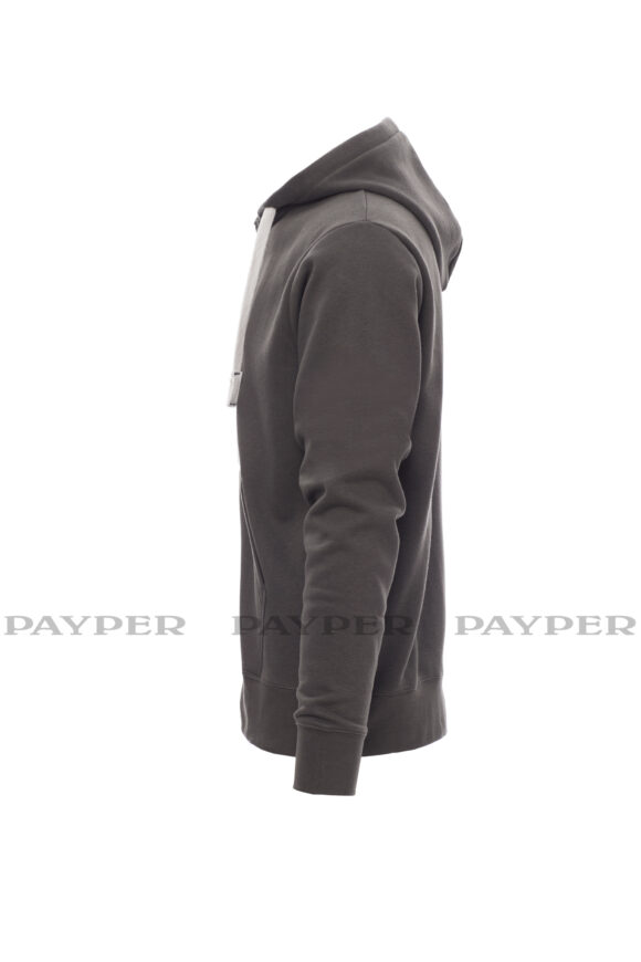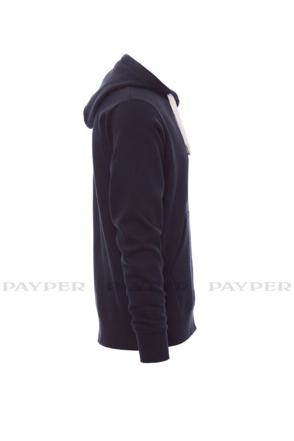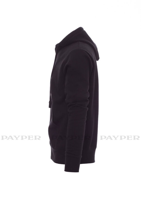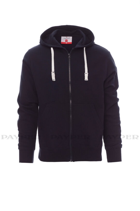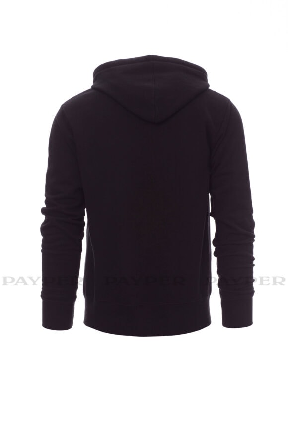 Pánska mikina s kapucňou s plastovým skrytým celozipsom s jedným kovovým jazdcom, kapucňa, sťahovacia šnúrka s farebne zladeným prešitím, všívané rukávy, klokanie vrecko, manžety a pás s elastickým rebrovaním, zosilnené švy. Vystužená páska zladenej farby na vnútornej strane krku.