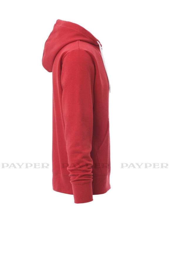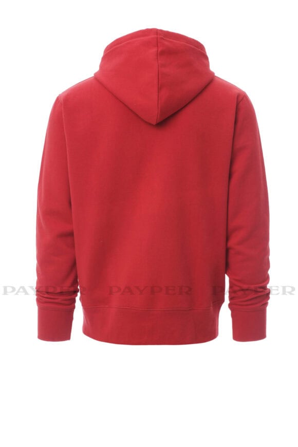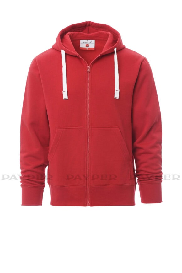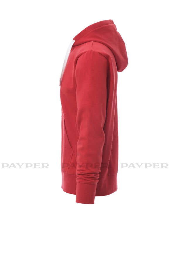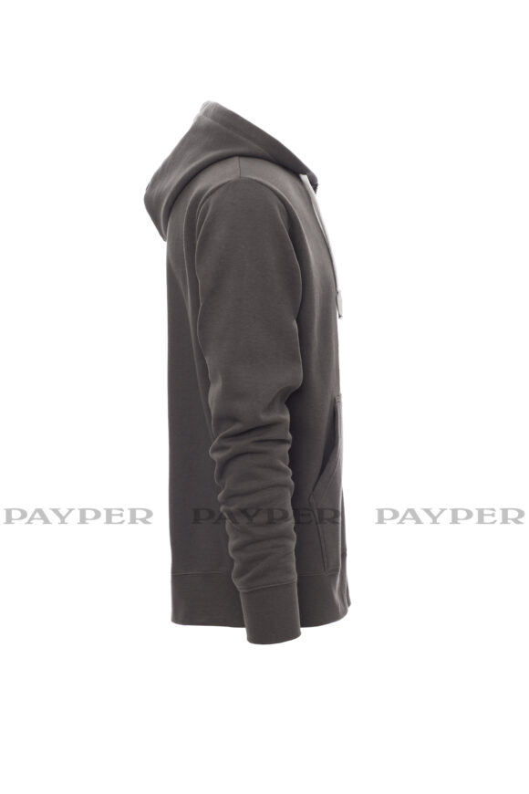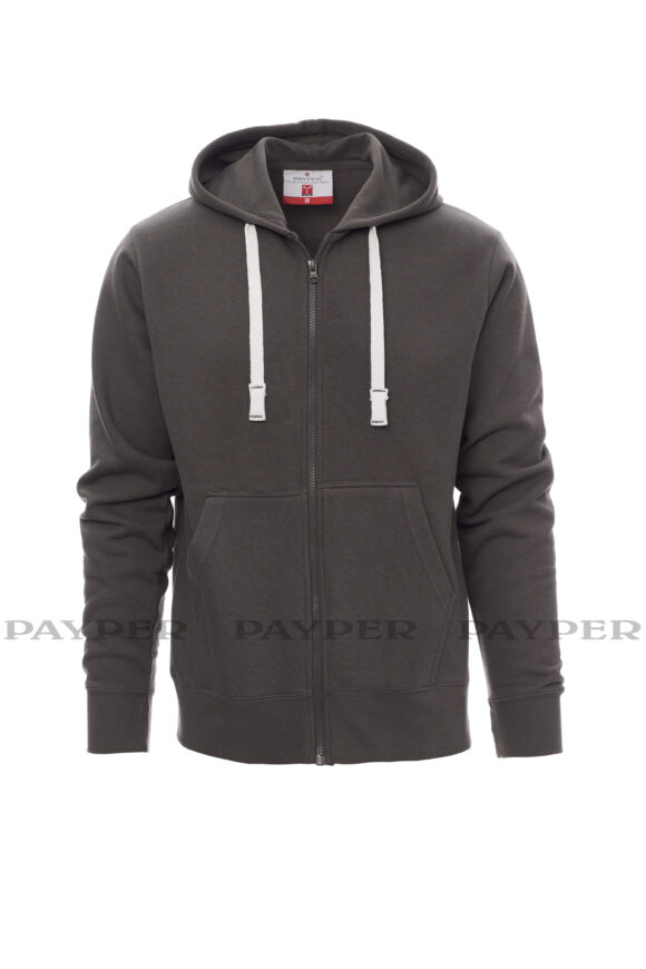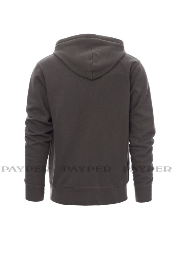 Pánska mikina s kapucňou s plastovým skrytým celozipsom s jedným kovovým jazdcom, kapucňa, sťahovacia šnúrka s farebne zladeným prešitím, všívané rukávy, klokanie vrecko, manžety a pás s elastickým rebrovaním, zosilnené švy. Vystužená páska zladenej farby na vnútornej strane krku.