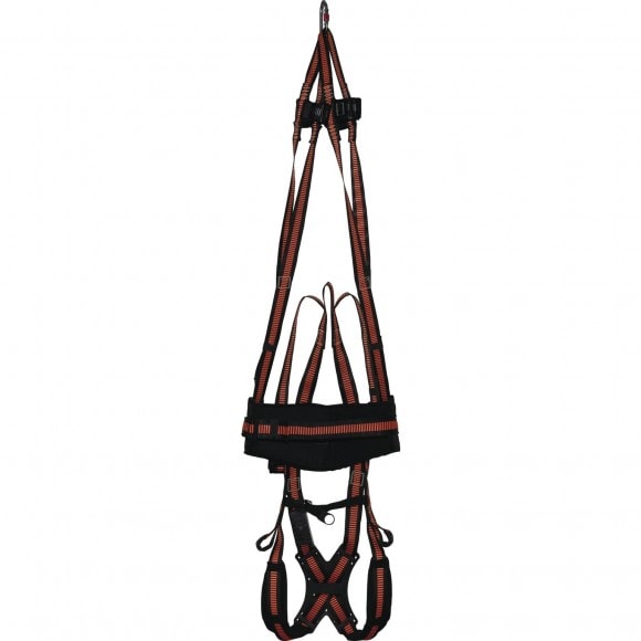 Postroj pre zvislý pohyb hlavou dole, so záchranným pásom. 3 body uchytenia postroja (hrudný, prsný a záchranný). 7 spôn.