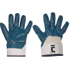 Modré rukavice šité z bavlneného úpletu, polomáčané v nitrile, s pevnou manžetou.