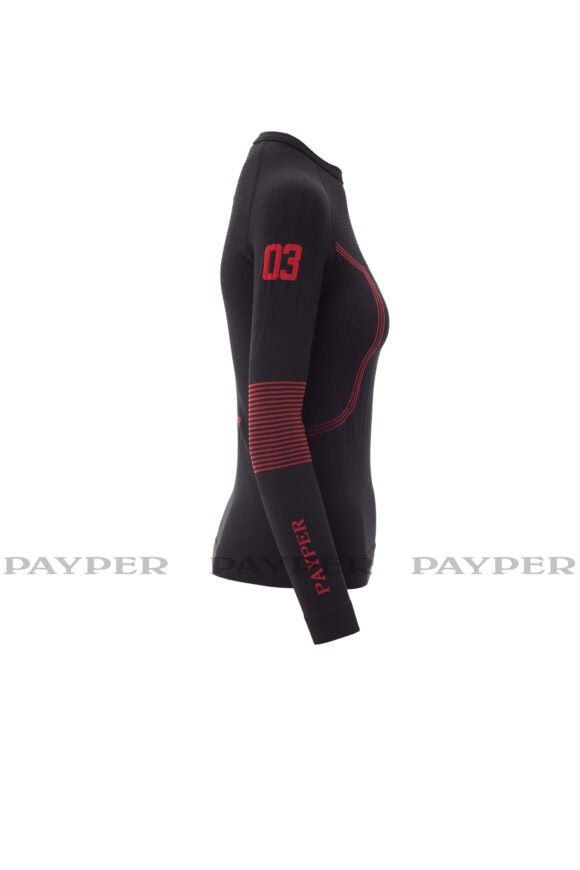 Dámske termo tričko s okrúhlym výstrihom a dlhým raglánovým rukávom. Mäkký strečový úplet, špeciálne textúry na hrudi a na chrbte, na bokoch špirálové reliéfne motívy na zaistenie správnej priedušnosti a stálej termoregulácie. Golier, spodná časť a lemy rukávov Zebrované z rovnakého materiálu, pre väčšie pohodlie. Ergonomická tubulárna štruktúra a špeciálne zdrsnenie na lakťoch zaisťuje dokonalé prispôsobenie sa fyziognómii tela. XS/S, M/L, XL/2XL